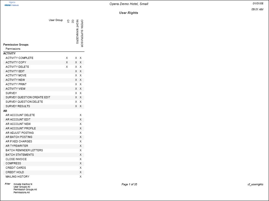 The Configuration Report for User Rights will display all users or user groups and the permissions or rights that have been configured in the application. Only user rights for product modules that are currently licensed at the property are included in the report.