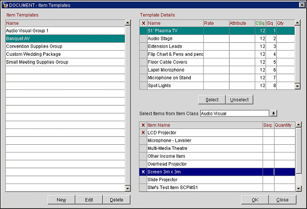 Item Templates are groupings of catering resources that alleviate the time consuming task of adding multiple individual items to an event. Templates can be used to create groupings of any items that would normally be used together. For instance, if most meeting and conference events often require an LCD Projector, a wireless lapel microphone and a viewing screen, these items can be grouped together using an item template. With item templates, items can be grouped together regardless of item class. This simplifies the task of adding item resources to events by eliminating the need to add items one at a time.